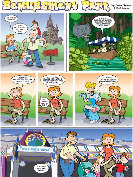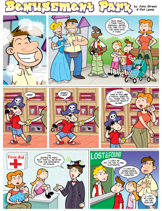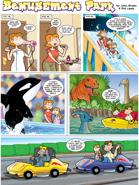 This strip appears in each issue of Orlando Attractions Magazine and it revolves around a family that is perpetually at the various theme parks in Florida. I co-created it with writer Pat Lewis and a few of the strips can be seen below:
